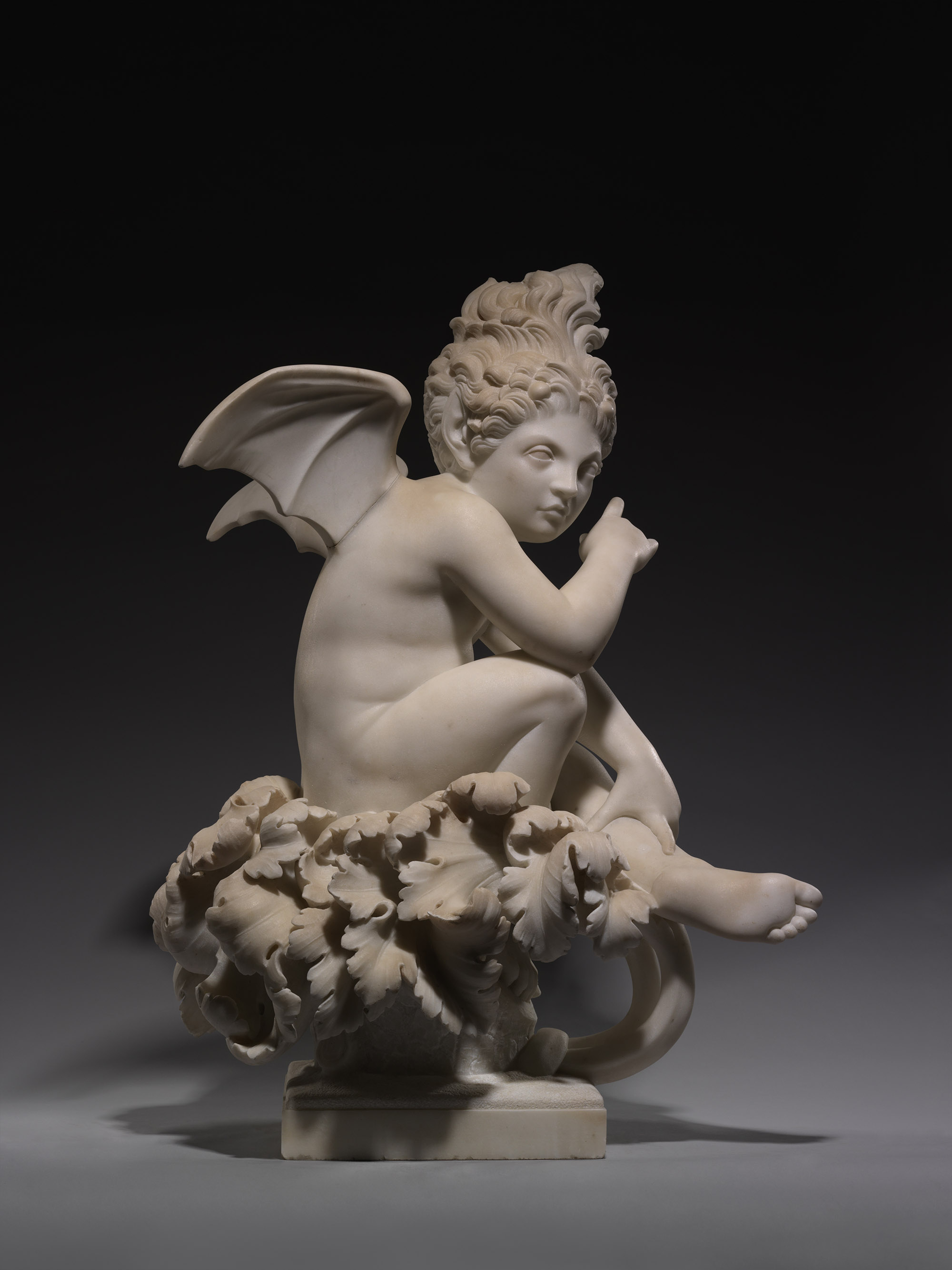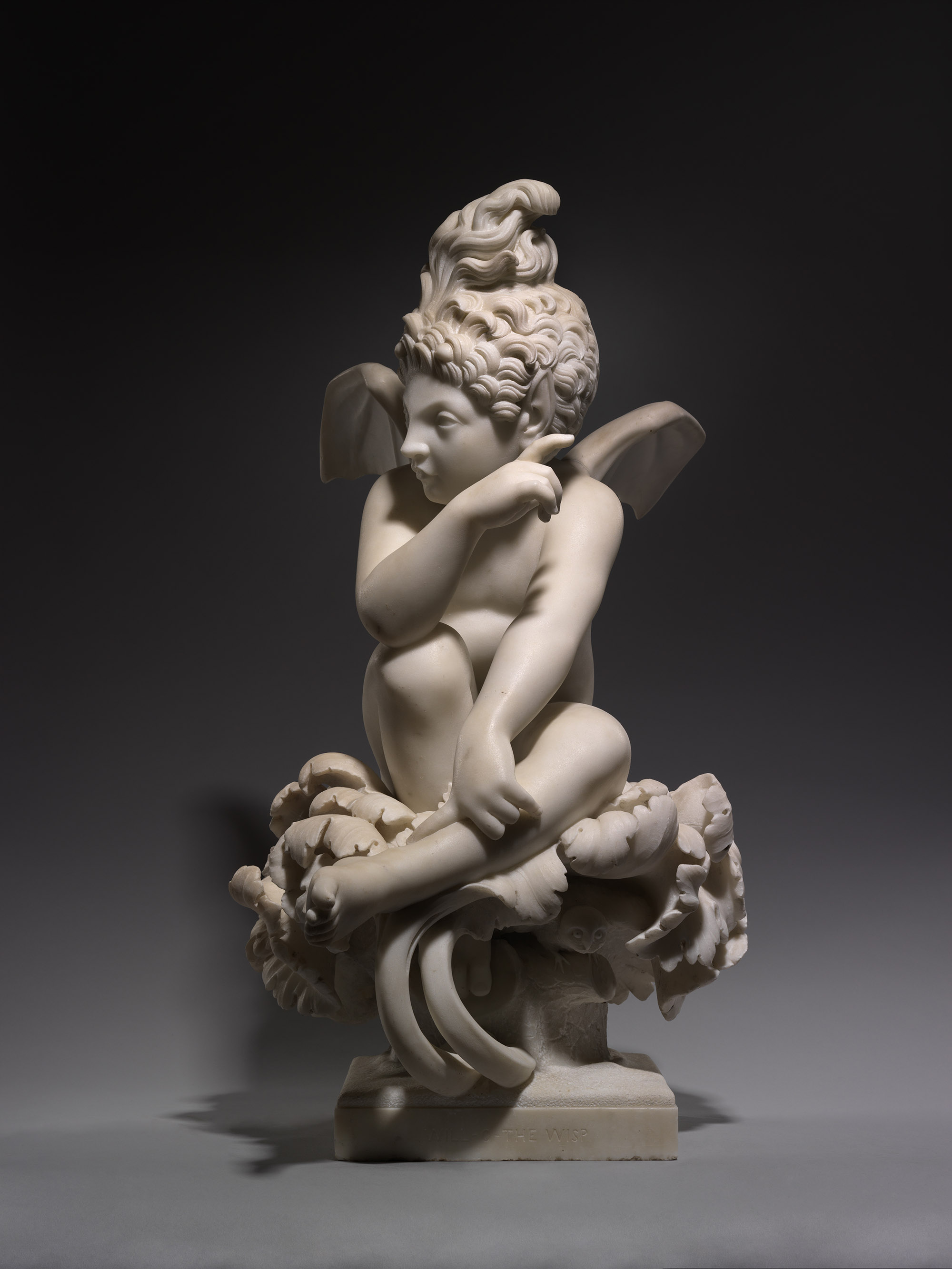 This marble sculpture of Puck, the mischievous sprite from Shakespeare's A Midsummer Night’s Dream, together with his companion figure of Will-o’-the-wisp, was the American artist Harriet Hosmer's most popular composition. Hosmer was one of the most successful female artists of the 19th century and spent most of her life living and working in Rome. There she was a leading figure in an important group of women artists known as the ‘sisterhood of American lady sculptors' who expressed their feminist and anti-slavery views through the neoclassical sculptures they produced.