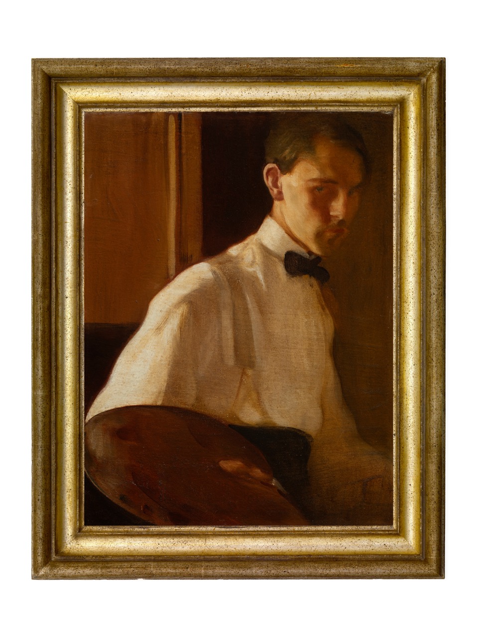 A lover of music and a talented violinist, he developed the idea of a chromatic harmony orchestrated around a dominant tone; a theory that, although with more programmatic intentions, linked him to his friend, Gino Parin. This self-portrait - painted on the reverse with the portrait of a woman - is particularly important as it is one of the rare instances in which the young artist depicted himself at work in his studio.